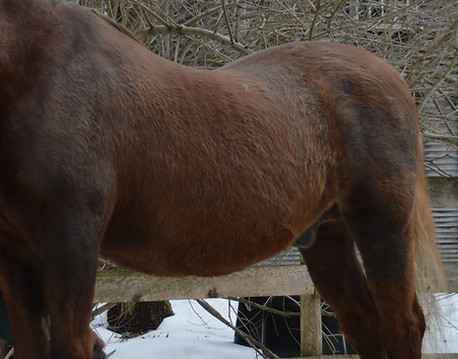Experiencing crookedness, inverted posture, hind end shearing away, stressful expression